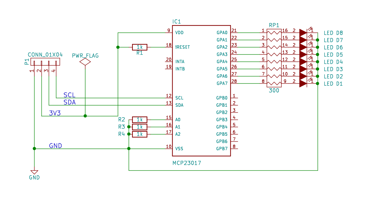 Jest to typowa najprostsza aplikacja, Ze schematu można wyczytać, że układ będzie znajdował się pod adresem bazowym 0x20 (A0 = A1 = A2 = GND). Należy też pamiętać o podciągnięciu pinu RESET (rezystor 1k) oraz ograniczeniu prądu diod LED (300 ohm). Oczywiście, w naszych dalszych projektach można użyć drugiego portu (np jako wejściowego) oraz sygnałów przerwań (by np. nasz CT zareagował na zmiany na porcie). Na potrzeby naszego tutoriala wystarczy nam informacja, że układ MCP23017 będzie pracował w trybie domyślnym (IOCON.BANK = 0), czyli rejestry od obu portów poukładane są zamiennie jeden po drugim... po szczegóły odsyłam do serwisówki (str. 17). A oto masz krótki program: